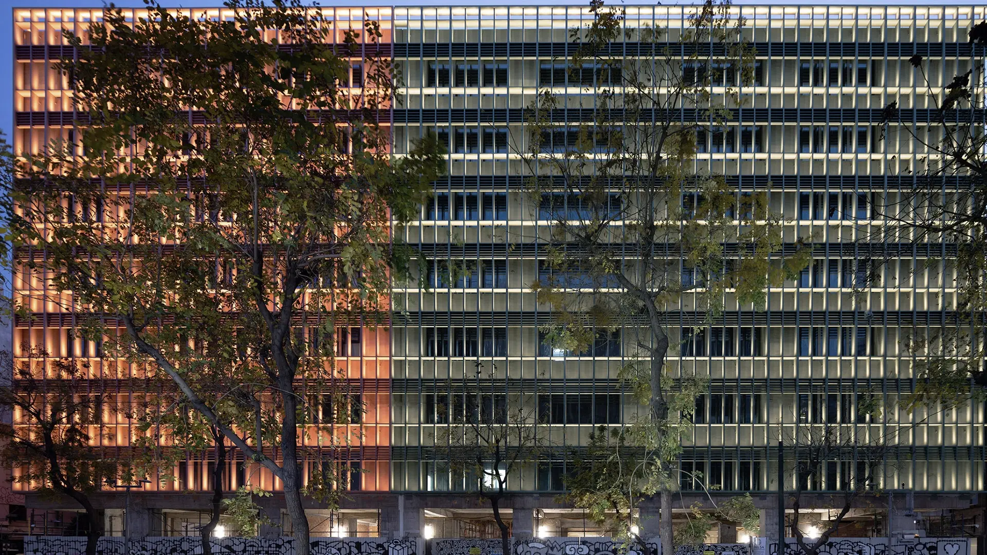 The regenerated, bioclimatic building was illuminated in three colors, orange, which was MINION’s trademark, olive green, and white, a few months before the completion of the project, highlighting the new architecture of the facades and the creation of a night landmark in the center of Athens, as an integral part of Athens new image, environmentally responsible towards its energy consumption and light pollution.