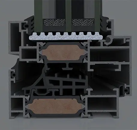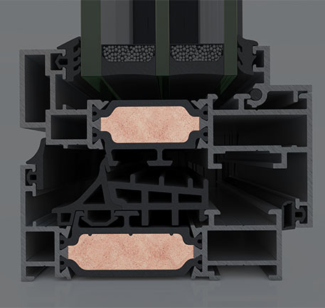 Σε όλα τα προφίλ του συστήματος εφαρμόζονται μονωτικές ράβδοι πλάτους 42mm με υαλοενίσχυση 25%, προσφέροντας υψηλά επίπεδα θερμομόνωσης και εξαιρετική στατική αντοχή. -