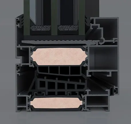 Wide insulating bars with 25% glass fibre reinforcement of 54mm, are applied to all system profiles, offering high thermal insulation levels and extra rigidity. -