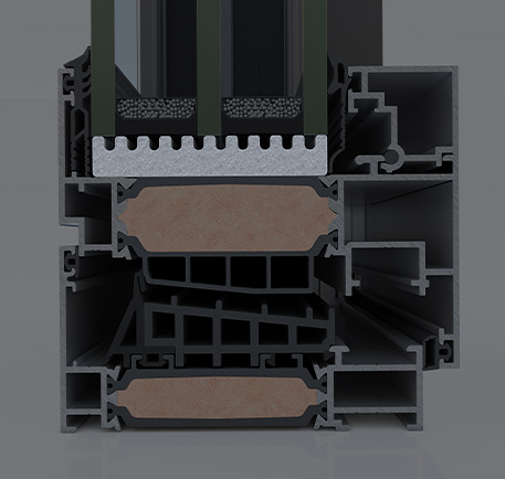 Wide insulating bars with 25% glass fibre reinforcement of 54mm, are applied to all system profiles, offering high thermal insulation levels and extra rigidity. -