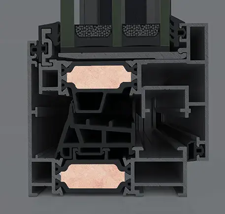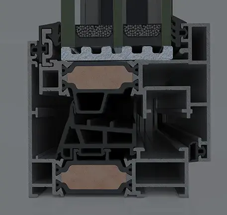 Wide insulating bars with 25% glass fibre reinforcement of 32mm, are applied to all system profiles, offering high thermal insulation levels and extra rigidity. -
