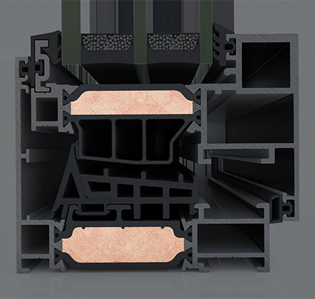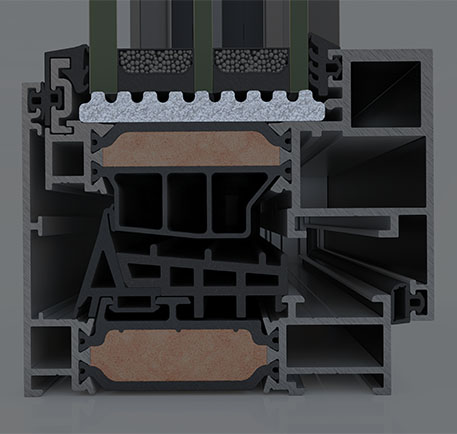 Wide insulating bars with 25% glass fibre reinforcement of 42mm, are applied to all system profiles, offering high thermal insulation levels and extra rigidity. -