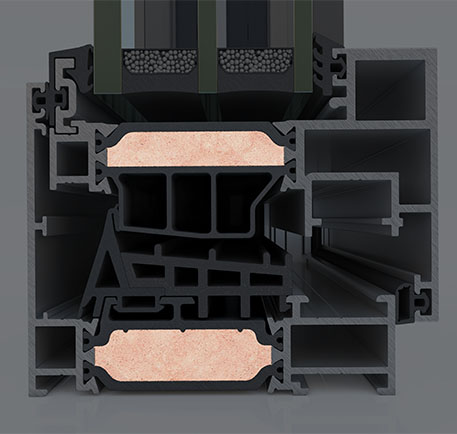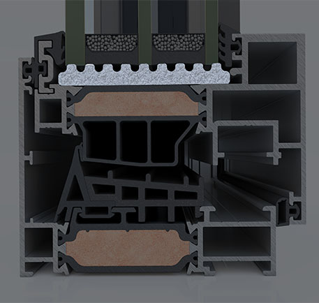 Wide insulating bars with 25% glass fibre reinforcement of 42mm, are applied to all system profiles, offering high thermal insulation levels and extra rigidity. -