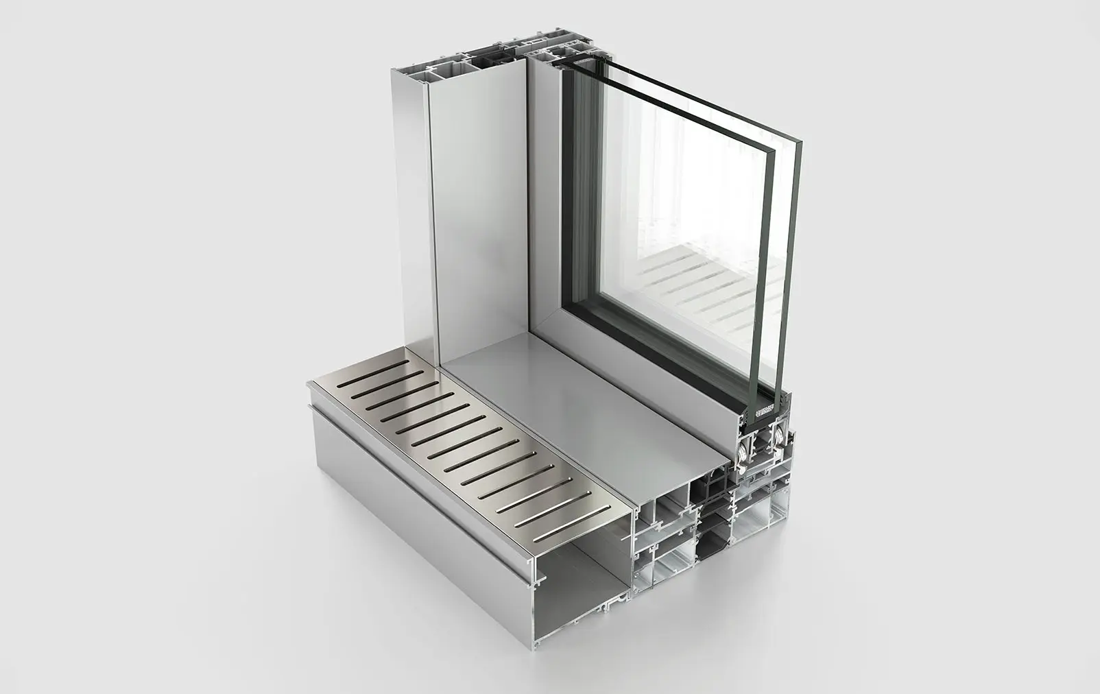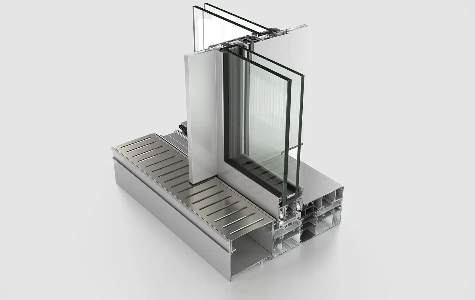 Customized aluminum fixing accessories positioned along the height of the middle vertical mullion, offering extra rigidity of the construction even at large dimensions. -
